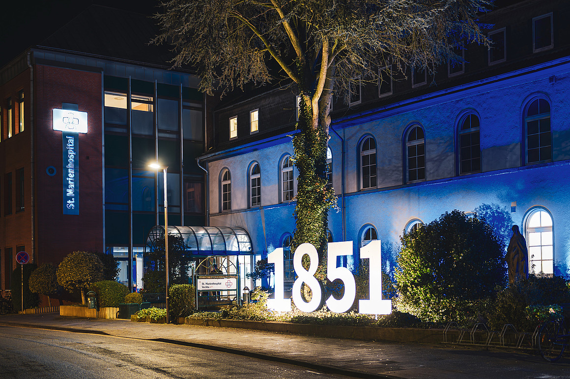 Mit der Illumination setzt das St. Marienhospital ein sichtbares Zeichen seiner engen Verbundenheit mit den Menschen in Vechta und der Region. Die illuminierte Fassade eröffnet symbolisch das Jubiläumsjahr und steht zugleich für Tradition, Gemeinschaft und Engagement, die das Haus seit 175 Jahren prägen.